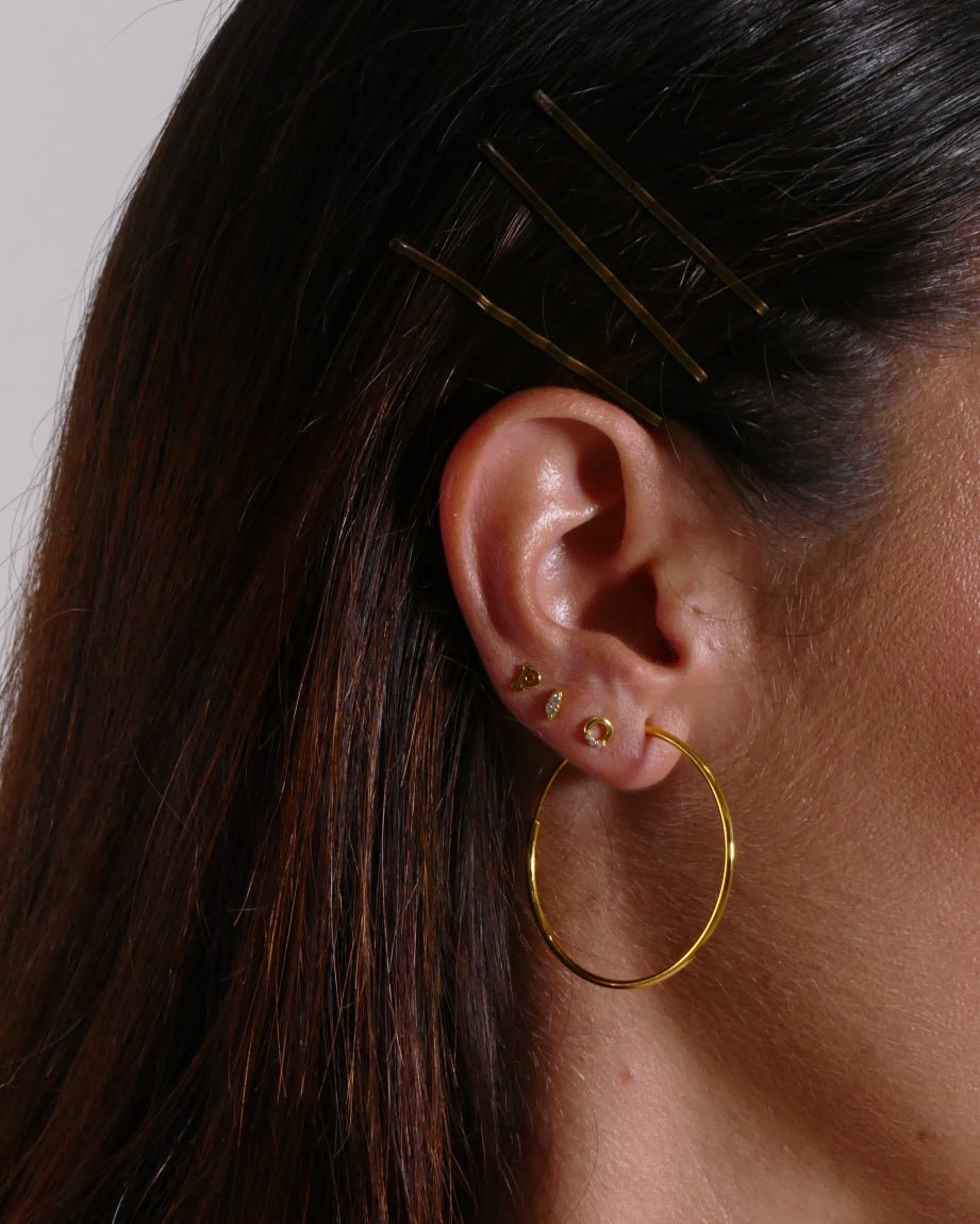 This stud earring with small white zircons will give the ideal touch to your earring combinations. Made of 925 Sterling Silver and plated in 18K gold.